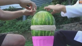 Hemos visto muchas sandías explotar con petardos, disparos o incluso partidas a base de cabezazos, pero en este experimento buscan reventar la pieza a base de gomas de plástico.
